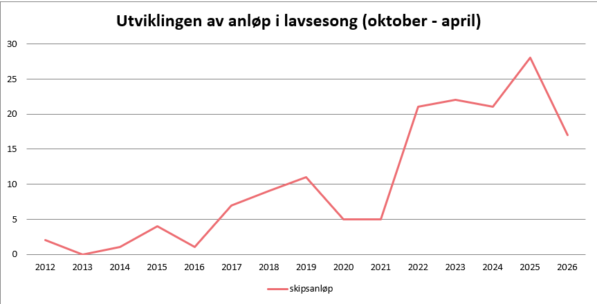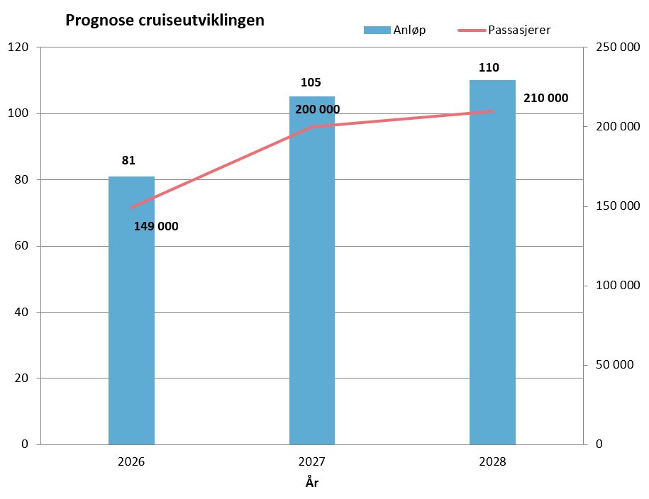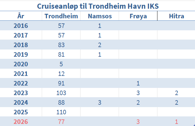 Prognosen viser til forventet anløps- og passasjertallutvikling for Trondheim Havn. Passasjertallet viser til maksimal kapasitet.Oversikt over cruiseanløp til Trondheim Havn sine cruisedestinasjoner. 2026 er bestillinger per 31.12.2025.